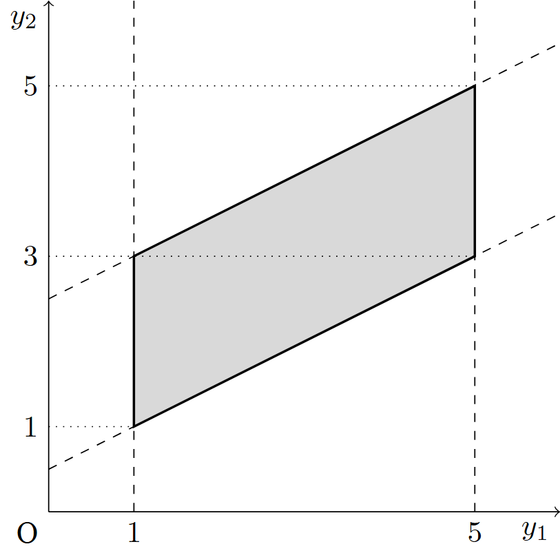 \[ \begin{cases}1\leqq y_1\leqq 5&\\ 1\leqq y_2\leqq 5&\\ 1\leqq 2y_2-y_1\leqq 5&\cdots (\rm ii)\end{cases}\]