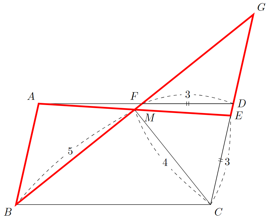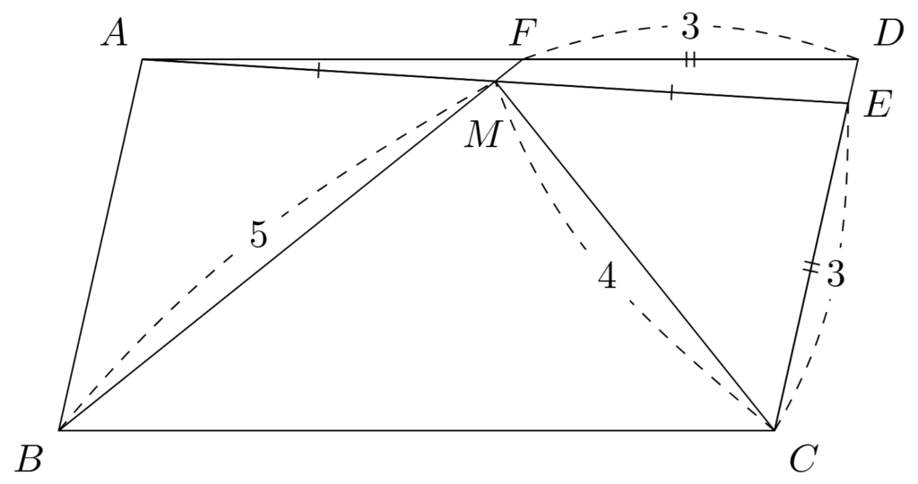 一般論はここまでにしておいて,本問に取り組んでいこう.まず,今回は$4$つの線分について,その具体的な長さが与えられているが,一度それは忘れて,$AM=EM$と$CE=DF$をどのように利用するべきかを考えよう.