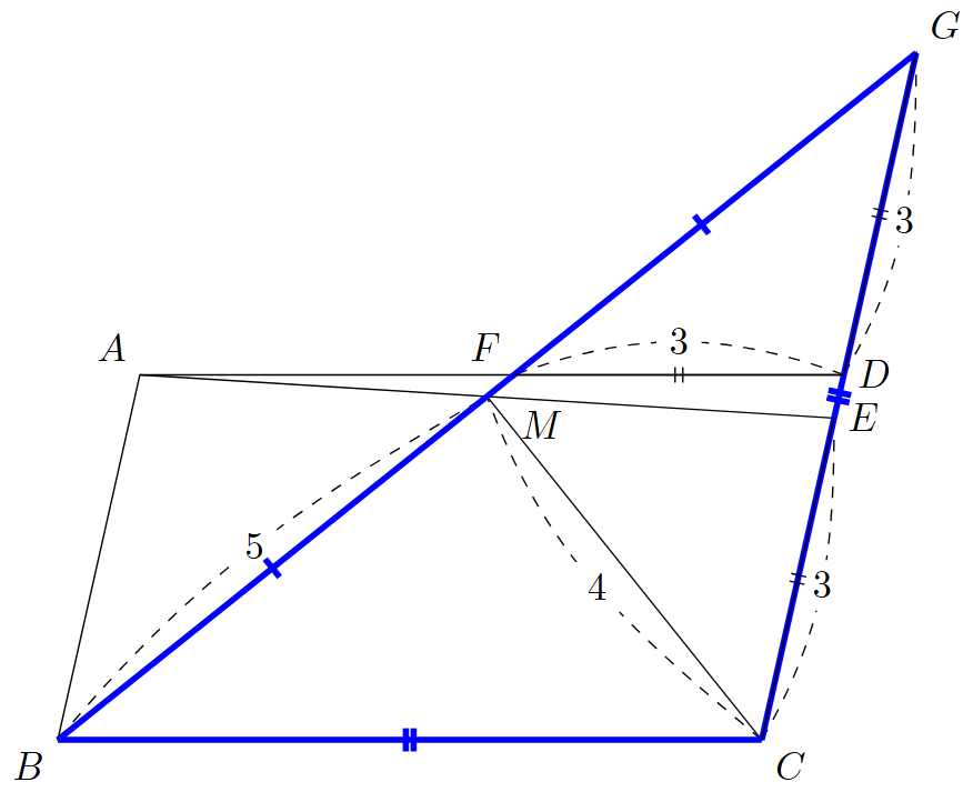 $CE$と$DF$は少し扱いにくい位置にあるため,まず$AM$と$EM$について考えてみる.先ほどの一般論と合わせて考えると,最も自然な発想は,直線$BF$と直線$CD$の交点$G$をとり,三角形$ABM$と三角形$EGM$に注目することである.