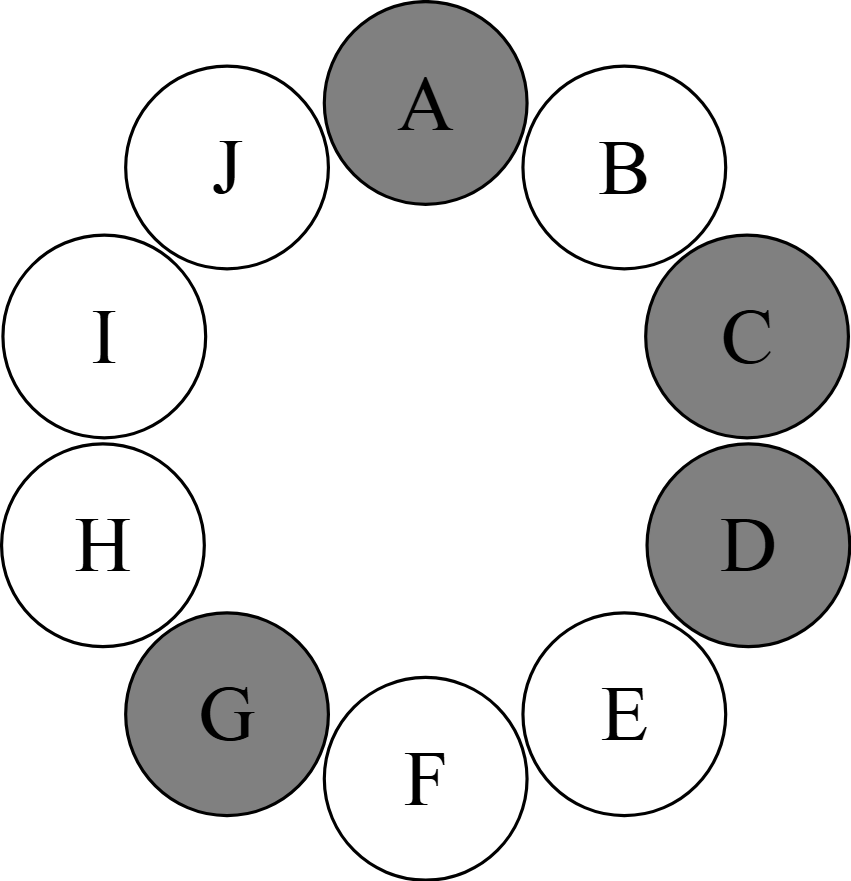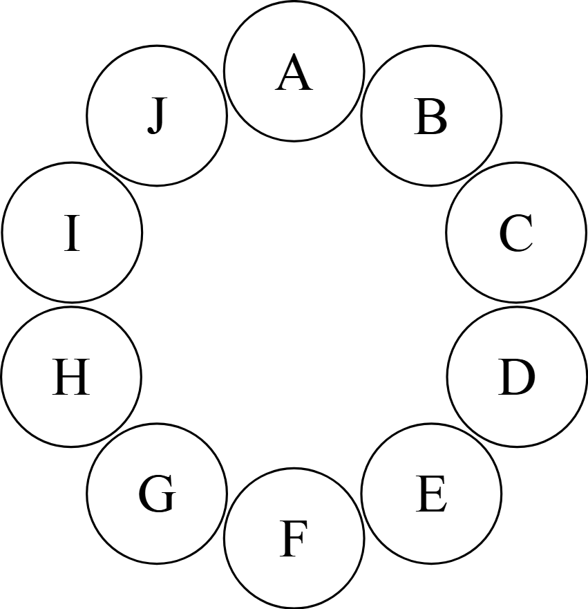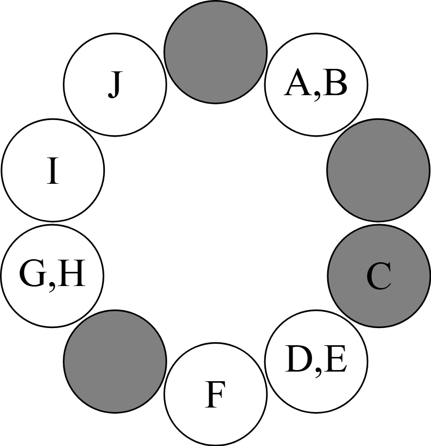 まず,上図のように10台のベンチを配置し,そこに座っている生徒を$\rm A,B,\dots ,J$とする.