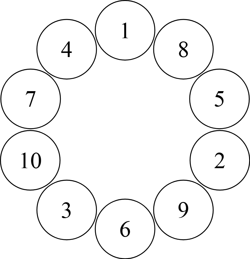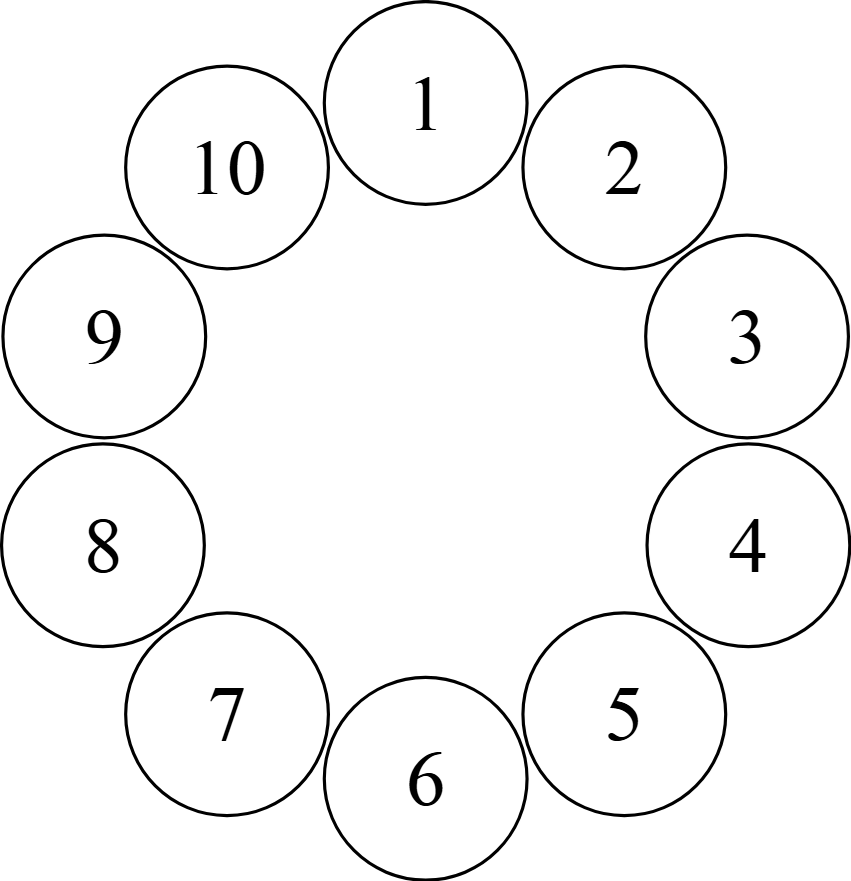 上図では,まず,最初に$\rm A$が座っていたベンチを$1$とし,その後,時計回りに$2$つのベンチを飛ばして番号を振っている.