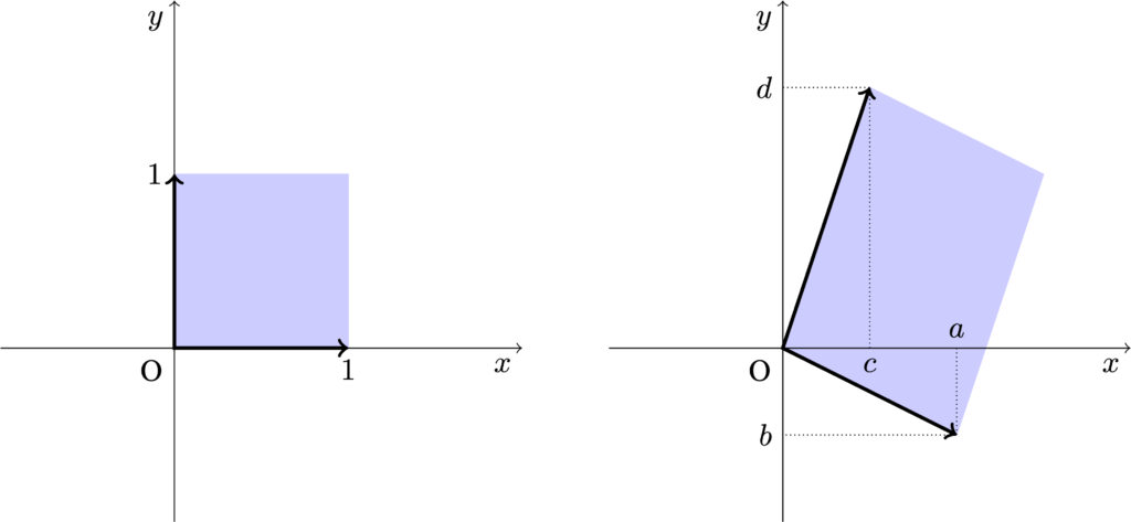 単位行列$\begin{pmatrix}1&0\\ 0&1\end{pmatrix}$が表す座標系における平面図形を,行列$\begin{pmatrix}a&c\\ b&d\end{pmatrix}$が表す座標系に変換したとき,その面積の拡大率を表すものとして,行列式が定義される.