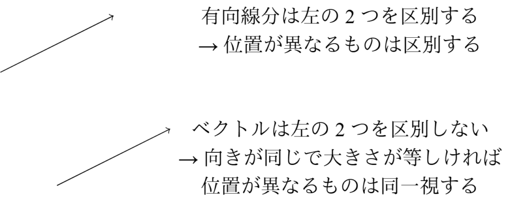 有向線分は「位置・向き・大きさ」の3つのみで決まるものであり,ベクトルは「向き・大きさ」の2つのみで決まる量である.すなわち,位置が異なる有向線分を同一視したものがベクトルである.また,スカラーは「大きさ」のみで決まる量であるため,向きが異なるベクトルを同一視したものがスカラーである.例えば,実数は大きさのみで決まる量であるから,スカラーの一種である.