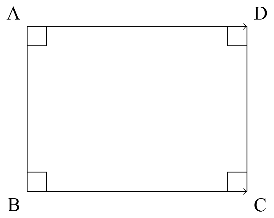 以下の長方形$\rm ABCD$において,辺$\rm AD$と辺$\rm BC$は平行であり,その長さは等しいから,$\overrightarrow{\rm AD}=\overrightarrow{\rm BC}$が成り立つ.
