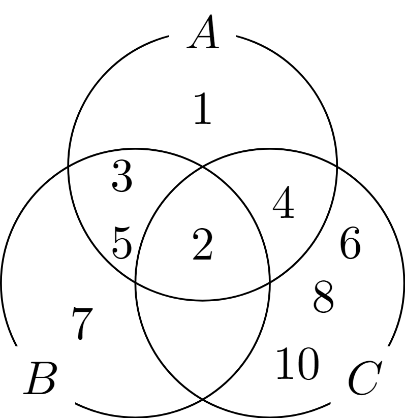 $A,B,C$の共通部分をベン図を用いて可視化すると,次のようになる.