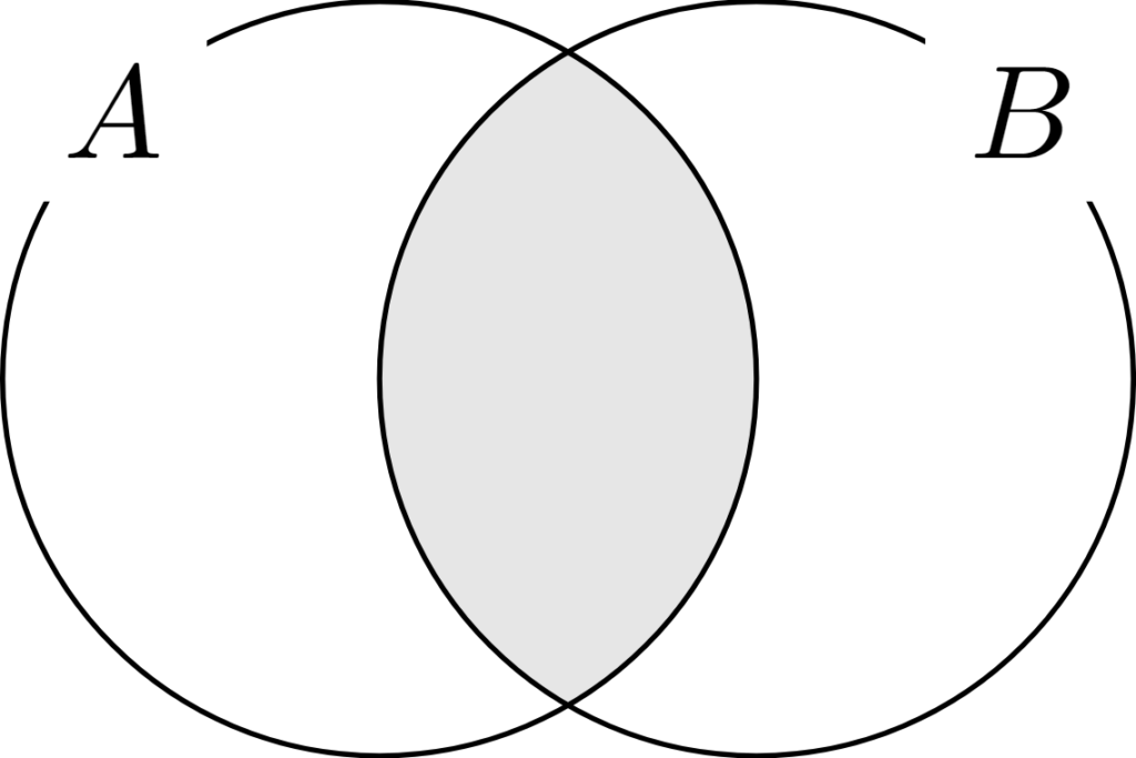 $A$と$B$の共通部分$A\cap B$は,図1の灰色部分に相当する.$A$の元でもあり,$B$の元でもあることは,2つの集合を表す円の内部の領域が重なっている領域に対応することから,視覚的に理解することができるだろう.