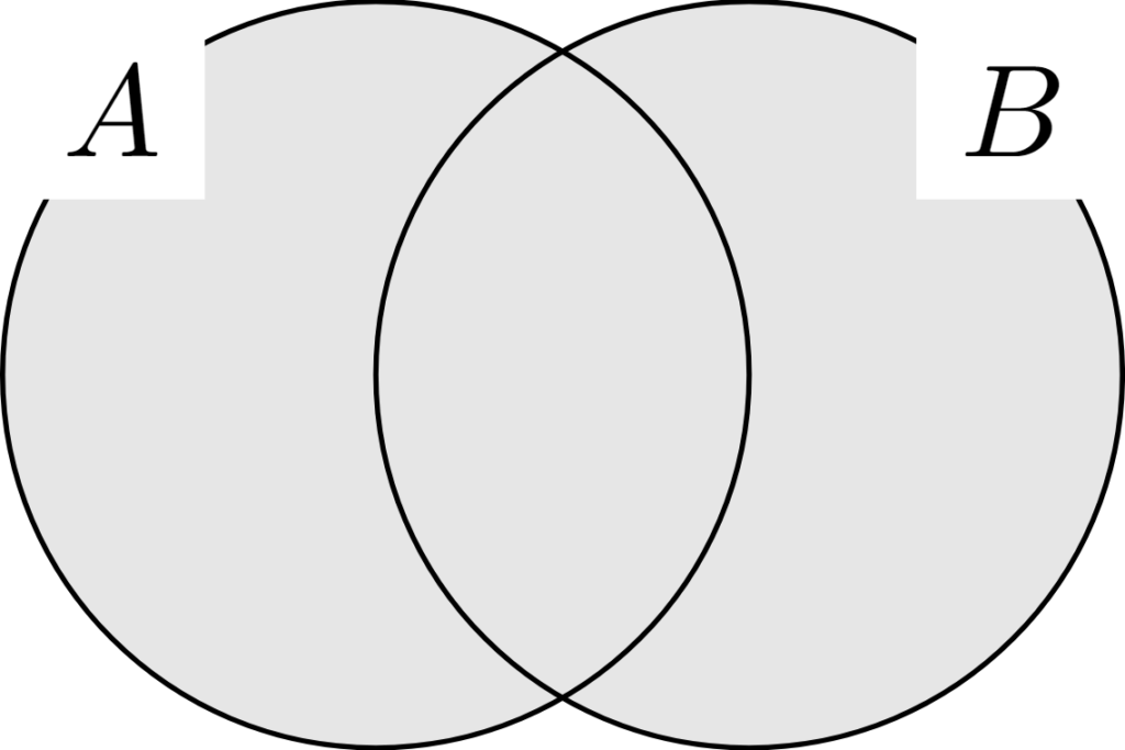 $A$と$B$の和集合$A\cup B$は,図2の灰色部分に相当する.$A$または$B$の少なくとも一方の元であることは,2つの集合を表す円の内部の領域を合わせた領域に対応することから,視覚的に理解することができるだろう.