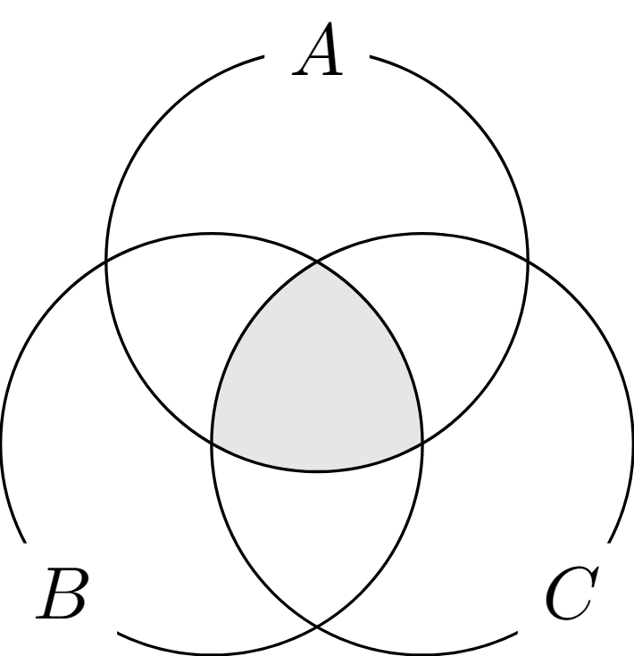 それぞれの集合を表す円の内部の領域がすべて重なる領域(灰色部分)が$A\cap B\cap C$に対応する.