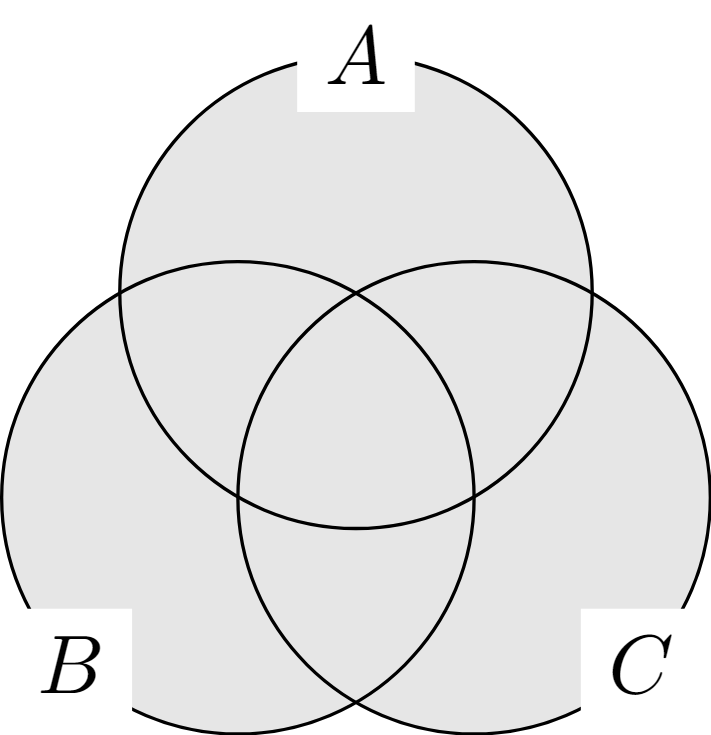 それぞれの集合を表す円の内部の領域を合わせた領域(灰色部分)が$A\cup B\cup C$に対応する.
