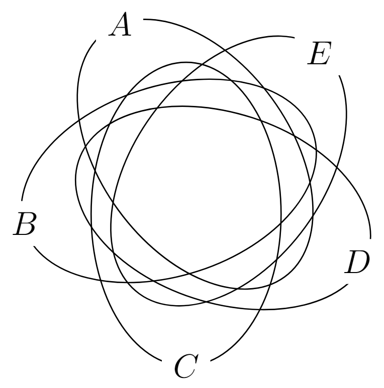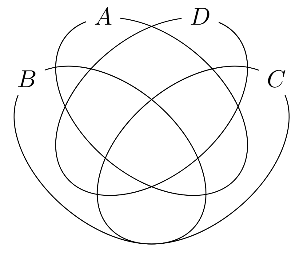 一方で,集合の数が4つ以上になると,ベン図を描くためには,それぞれの集合を円の内部の領域で表すことはできない.