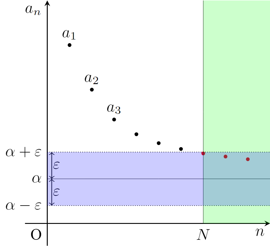 上の図は,$\varepsilon$-$N$論法のイメージである.$n$が$N$以上のとき,$a_n$(赤点)と$\alpha$の距離は$\varepsilon$以下になっている.「どんな$\varepsilon >0$をとってきても,$N$を十分大きくとれば,$N$以上の$n$(緑の領域内にある$n$)に対して,$a_n$が青の領域内に入る」.これが$\varepsilon$-$N$論法の本質であり,$\displaystyle \lim_{n\to \infty}a_n=\alpha$の定義である.