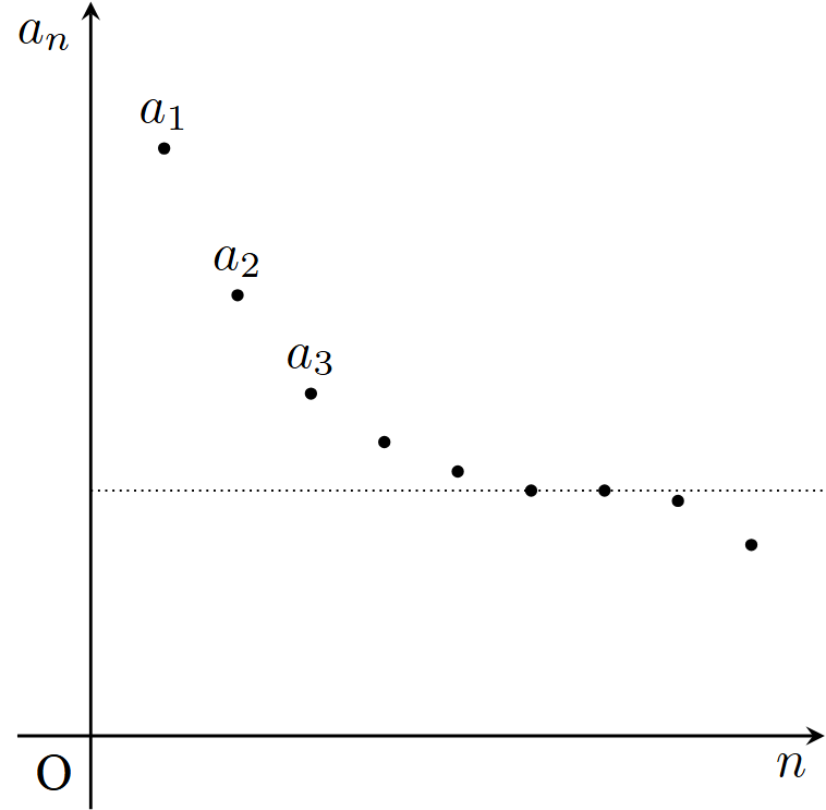 | 狭義単調減少 | $\forall n\in \mathbb{N},a_n>a_{n+1}$ |