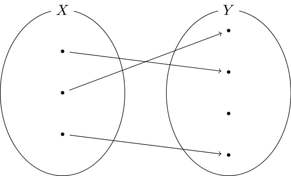 例えば,$f(\pm 1)=1$であるから,$f$は単射でない. - $X=\{ 1,2,3\} ,Y=\{ 1,2,3,4,5\}$とする.
