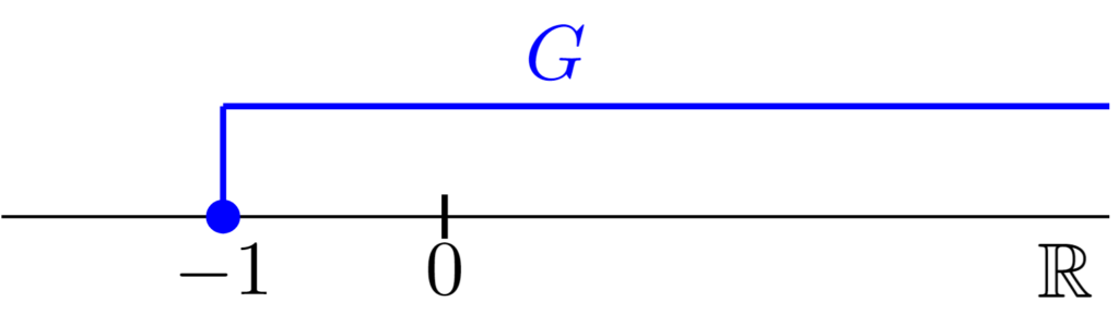 $G=[-1,\infty )=\{ x\mid x\ge -1\}$の最小値は$-1$,最大値は存在しない.$G$の下界全体の集合を$L(G)$とすると,$L(G)=\{ x\in \mathbb{R}\mid x\le -1\}$である.また,$G$の上界は存在しない.